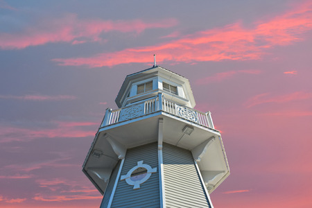 Lighthouse at riverside during sunrise. Blagoveshchensk, Amur region, Russia