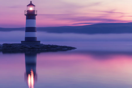 A lighthouse stands majestically at dawn, reflecting on the tranquil waters beneath a pastel sky.