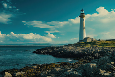 A majestic lighthouse stands tall on a rugged, rocky shore overlooking the vast ocean. The dramatic sky above hints at the changing moods of the sea, creating a timeless coastal vista.