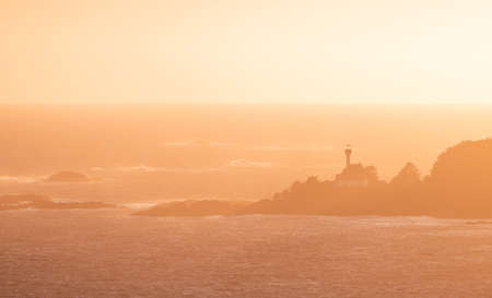 Lighthouse at the Pacific Ocean on a rocky shore. West Coast. Sunny Summer Sunset. Cox Bay, Tofino, Vancouver Island, BC, Canada. Canadian Nature Background.