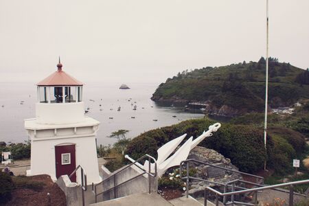 Memorial Lighthouse in Trinidad California, colorful flowers view and colorful bay and the USA flag