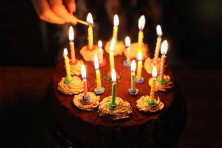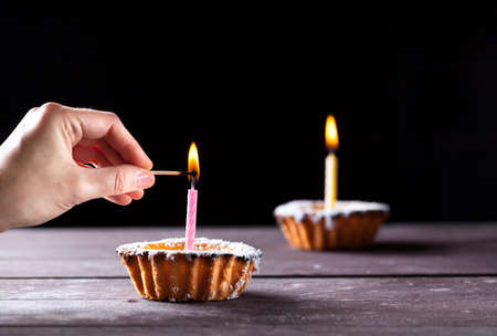 Human hand with matchstick, lighting a candle on a birthday cake, on a wooden desk
