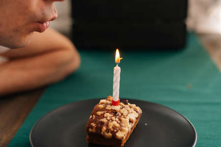 Close-up of blowing out candle on festive cupcake in room. Uunrecognizable man blowing out a candle on cake.