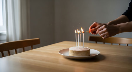 Hands lighting thin white candles on a simple round cake sitting on a wooden table. The minimalist scene captures the quiet preparation for a birthday celebration or special occasion.