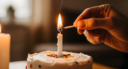 A hand uses a lit match to ignite a single white candle on top of a frosted cake with colorful sprinkles. The warm glow of the flame creates a celebratory atmosphere, symbolizing a birthday wish or anniversary.