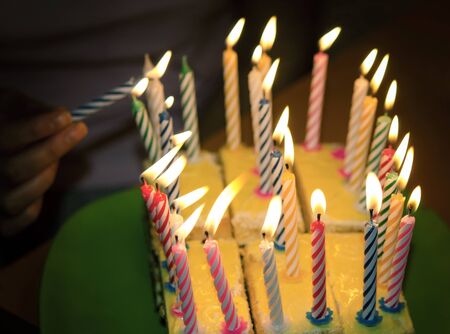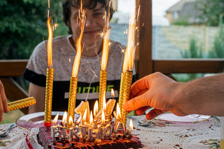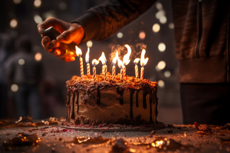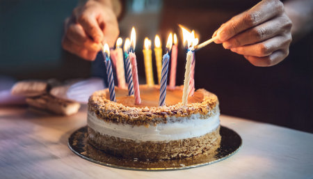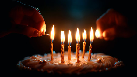 Warm light illuminates the birthday cake as candles are lit, creating a memorable moment of celebration and joy. Perfect for invitations and greetings now.