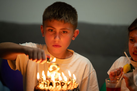 happy boy celebrates his 14th birthday with sparklers outdoors. Teenage period features