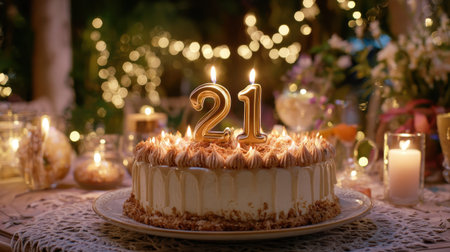 Celebratory Birthday Cake with Lit Candles and Festive Decorations for a 21st Birthday Celebration in a Beautiful Outdoor Setting