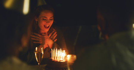 Happy woman, surprise and night with candles for birthday celebration, party or event. Female person, cake and desert with friends or wish for get together, anniversary or blessings in late evening