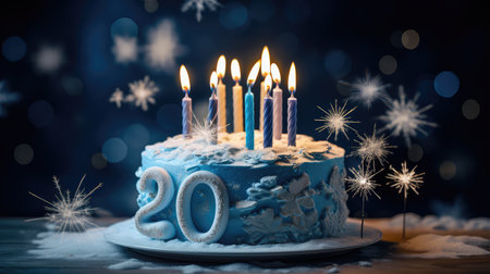 A beautiful cake decorated with swirls of icing and a sparkling twenty candles stands against a shimmering, dreamy background. This setting suggests a special birthday celebration filled with joy.
