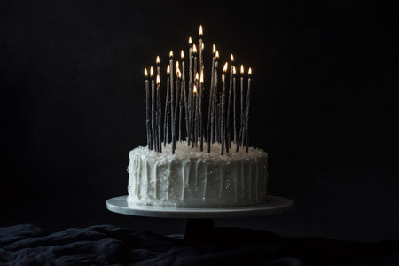 White frosting cake decorated with sparkling sprinkles and numerous lit candles on a marble stand against a dark background