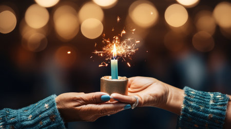 Two hands holding a lit candle in front of blurred bokeh, AI