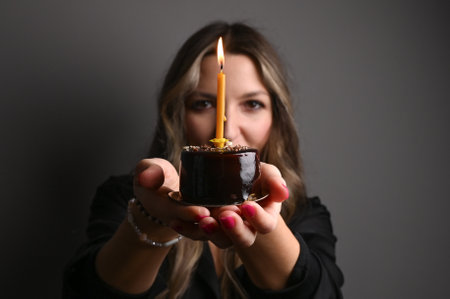 Chocolate birthday cake with a lit candle in hands of a blurred woman. Birthday celebration party.