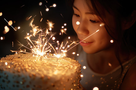 Young adult making a wish with a glowing candle during a special anniversary cake celebration.