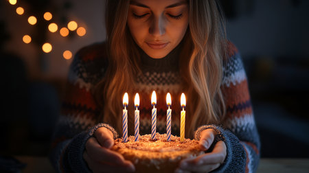 A unique Christmas birthday! Cozy hands in a knit sleeve blow out candles, surrounded by the warm glow of Christmas lights and winter magic.