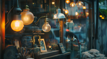 A vintage-style storefront window adorned with warm glowing lights, creating a cozy and inviting ambiance. Perfect for themes of nostalgia, retail, and decor.