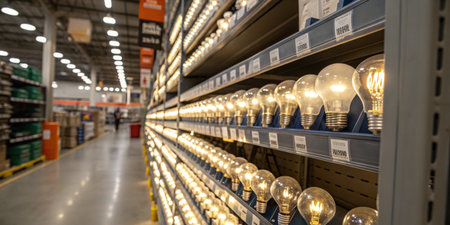 Brightly lit display of light bulbs showcases various types and sizes in a retail store. Customers browse the aisles in search of lighting solutions for their homes.