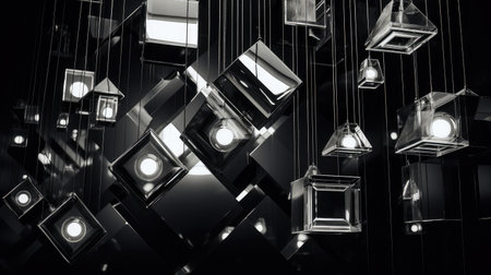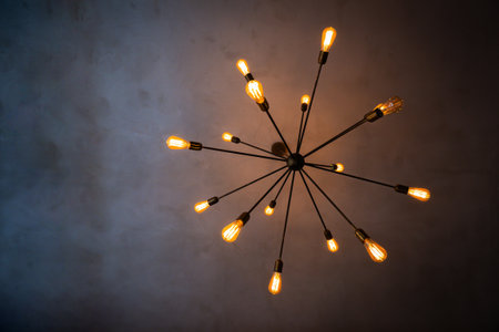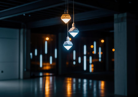 A dark room with a high ceiling adorned with modern, decorative electric lamps. The warm, diffused light creates a cozy ambiance, with ample space left in the background for text or additional elements.