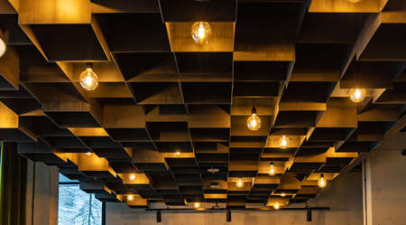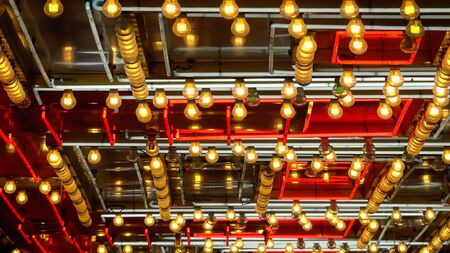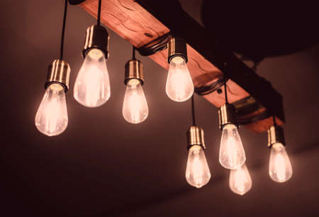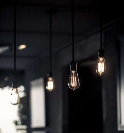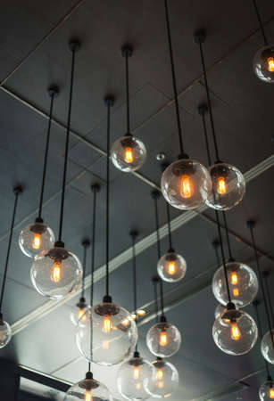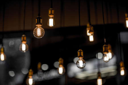 Vintage luxury interior lighting decor in cafe. old Vintage light bulb lamps. Restaurant Bar lighting interior design. Vintage Light bulbs.