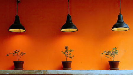 Three black pendant lamps hang above small potted plants, casted against a bright orange wall. The composition uses symmetry with overhead lighting creating warm highlights on the plants. This indoor scene evokes a sense of modern design. Suitable for interior design projects or commercial applications.