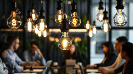 A roundtable discussion under a canopy of hanging lightbulbs, with one bulb shining brightest as a team member articulates their idea, highlighting the moment of insight and collective enthusiasm.