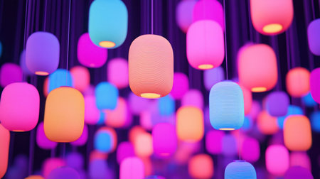 A vibrant display of hanging lanterns in various colors, creating a visually appealing and festive ambiance. The lanterns are illuminated, casting a soft glow.