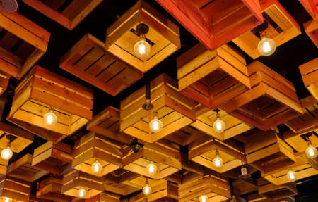 Singapore-16 MAR 2018: lamps hang on industry style wood roof