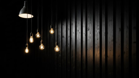 Several illuminated lightbulbs hang from the ceiling, their warm glow contrasting against a dark, vertically-grooved wooden panel. The composition features a shallow depth of field, emphasizing the central subject. This image may be suitable for illustrating design, technology, or interior concepts, and suitable for commercial usage.