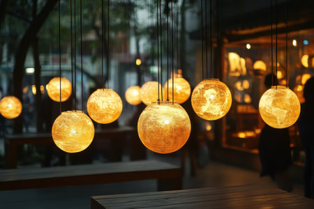 Softly glowing spherical lights hang from the ceiling, illuminating a contemporary space filled with wooden tables. The warm golden hues create an inviting atmosphere in the shop, attracting evening visitors.