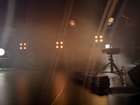 Concert stage and lighting fixtures on it, musical equipment. Smoke from a smoke installation gently breaks yellow light and creates the effect of a gentle glow.