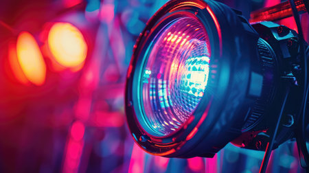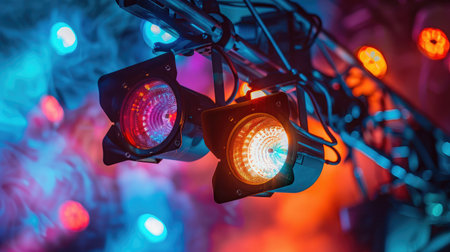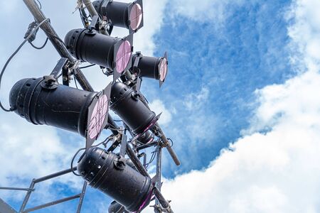 Modern stage theater floodlights and projector illumination equipment.