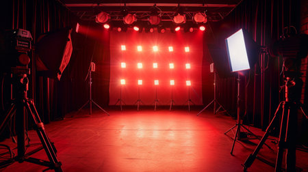 empty professional stage set for performance with dramatic lighting and modern stage equipment.