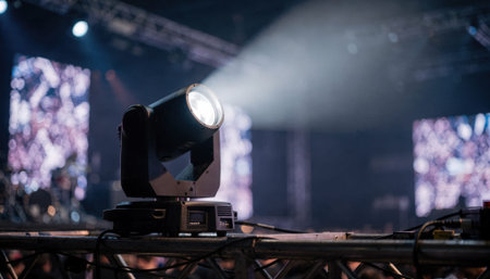 Medium shot of a robotic moving head light adjusting its pan and tilt angles with the rest of the stage blurred highlighting precise preshow automation.