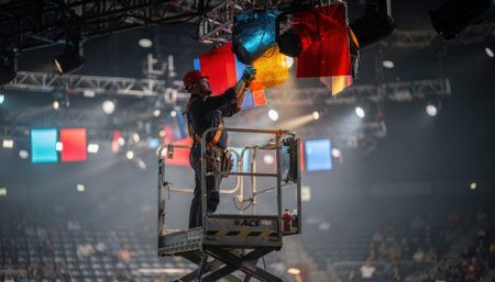 Stagehand on lift adjusting color gels with precision in sharp focus while concert stage and lighting rigs fade softly illustrating meticulous preshow color correction.