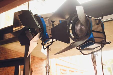 Studio light equipments for photo or film movie video. Light set for professional shooting studio background. LED Flood light and Spot light for video production studio. Setup include Barn door softbox.