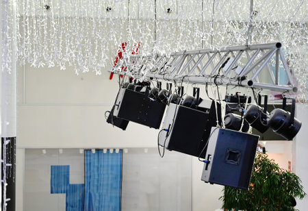 Suspended audio equipment hangs from a truss overhead in a bright indoor space, preparing for an upcoming event with decorative lighting in view.