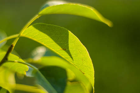 Close up of green leaves in the sunlight. Natural background and texture.