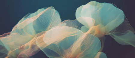 An ethereal fabric is captured in motion, illuminated by sunlight. The flowing material displays soft textures and a range of cream and white hues. The composition and lighting create an abstract and dynamic visual, suitable for various design applications and commercial purposes.