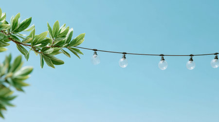 A beautiful scene showcasing string lights delicately hanging above lush green leaves, set against a clear blue sky, exuding a vibrant and festive outdoor atmosphere.