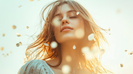 Dreamy sunlit portrait of a woman with floating flower petals and soft focus, evoking a serene and ethereal feeling.