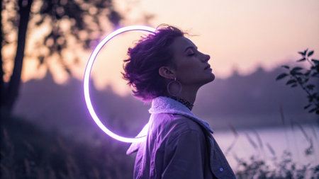 An artistic capture of a person with a glowing violet ring floating around their shoulders the abstract light creating a dreamy ambiance that complements their poise..