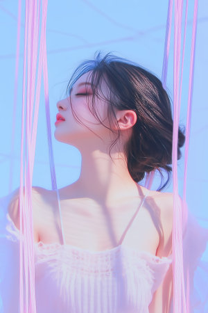 A woman stands in soft sunlight. Pink threads hang around her. High quality photo