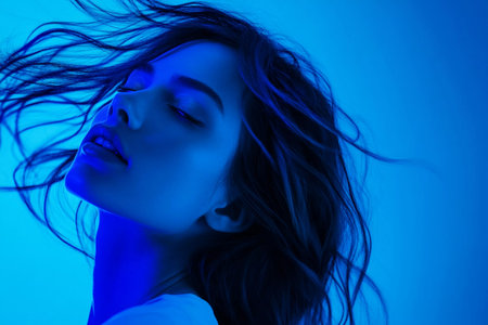 Under mesmerizing blue lights, a woman portrays grace with her hair dancing around her. The atmosphere captures a moment of tranquility and artistic expression, leaving a lasting impression.