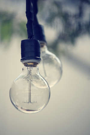 Vintage light bulbs on a the sunset background - Solar power concept. Light bulbs that are powered by photo voltaics are hanging on a balcony on a sunset background