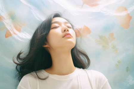 Portrait of beautiful young Asian woman breathing air with eyes closed.
