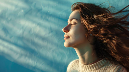 Portrait of beautiful female teenager face relaxing and sleeping surrounded with glowing aura while her hair blowing. Close up of attractive woman closing her eyes and absorbing power of light. AIG42.
