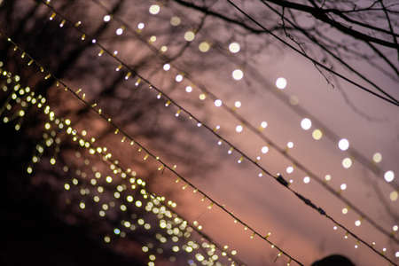 Light from garlands at sunrise on the park, christmas