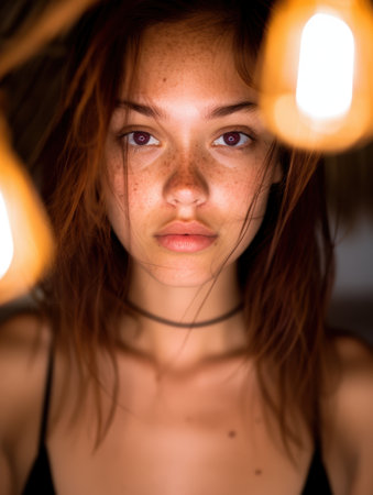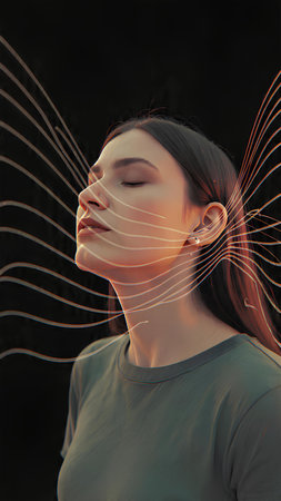 A contemplative young woman gazes slightly upward neon yellow wires framing her delicate face. The soft light creates an ethereal quality highlighting her thoughtful expression and.