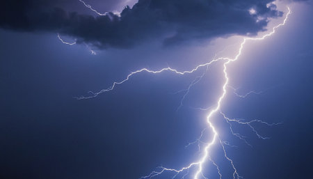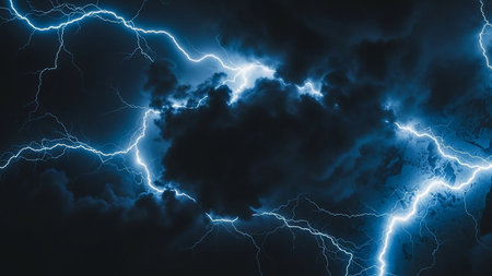 Vivid blue lightning bolts crackle and flash across dark, ominous storm clouds, creating a dramatic and powerful natural display.