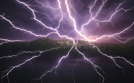 AI Generated. Dramatic lightning bolts illuminating dark stormy background